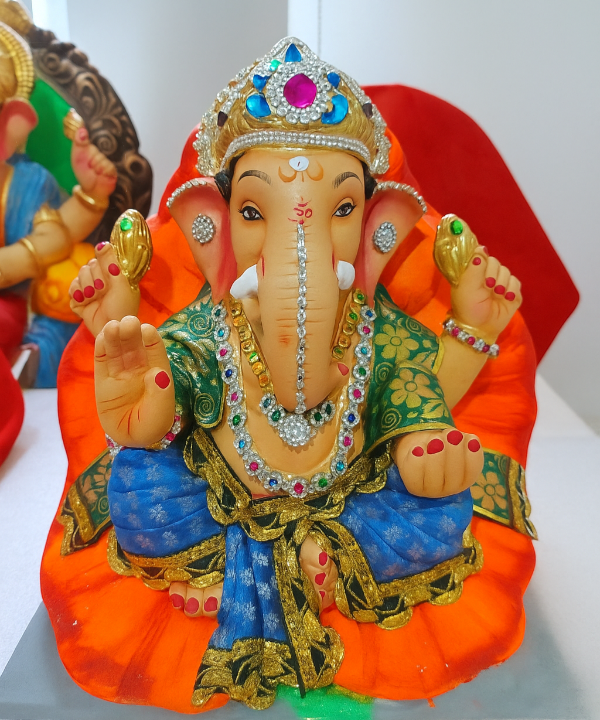 Introducing our 12-inch Jaswant-style Ganesh idol, a divine blend of artistry and tradition. This elegant idol is hand-painted, intricately adorned with diamond work, and styled with beautiful cloth embellishments for an extra touch of richness. The unique Jaswant posture adds a traditional charm, making it a standout piece for your home mandir or Ganesh Chaturthi celebration.