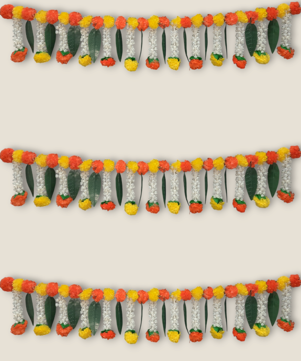 Vibrant Design : Combines orange and yellow marigold flowers with white jasmine and green mango leaves for an authentic festive look.