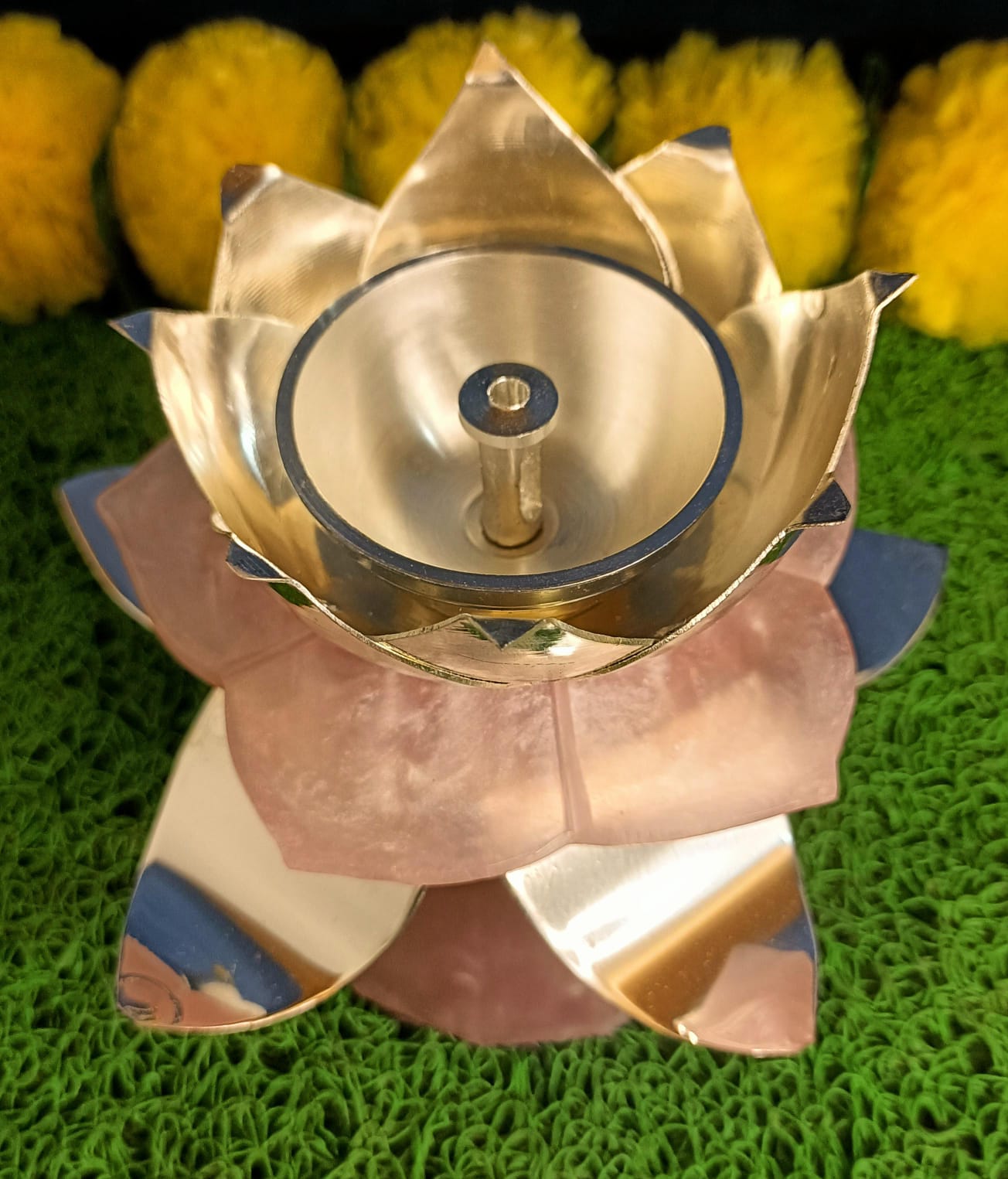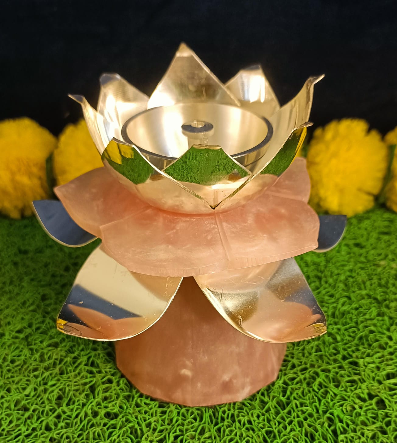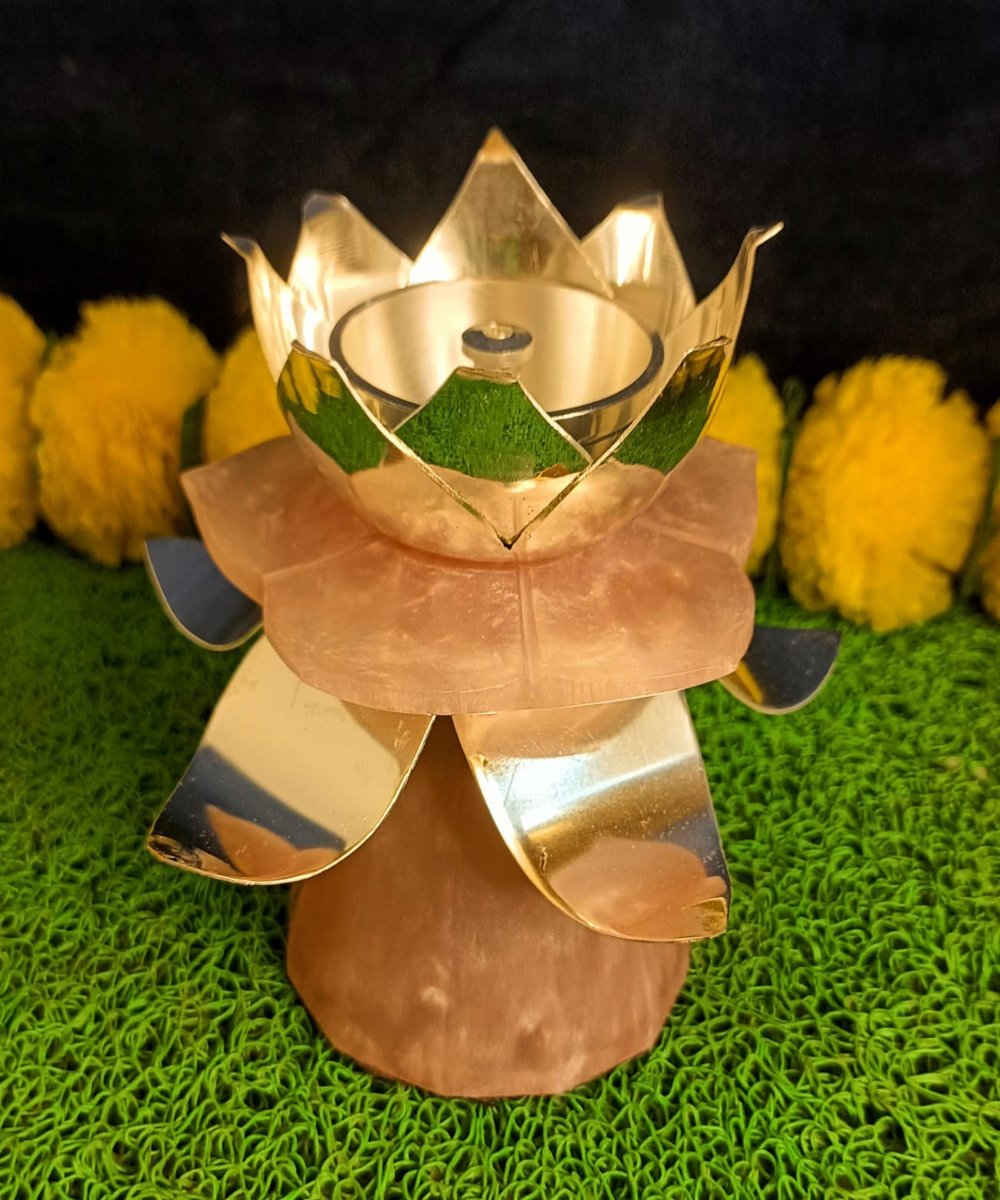 Enhance the ambiance of your home with our STONE FLOWER DIYA WITH STAND. Made of high-quality metal, this exquisite diya with stand adds a touch of elegance to any room. The intricate flower design not only adds beauty, but also provides a warm and peaceful glow when lit. Perfect for creating a serene atmosphere for meditation or relaxation.