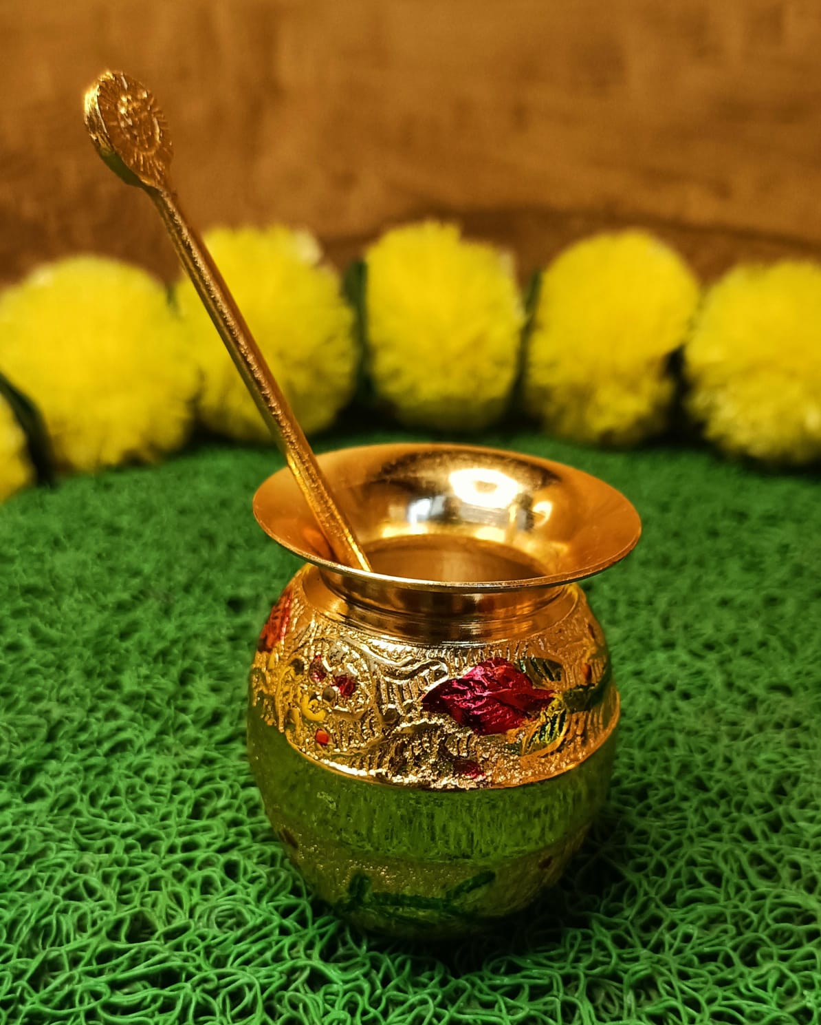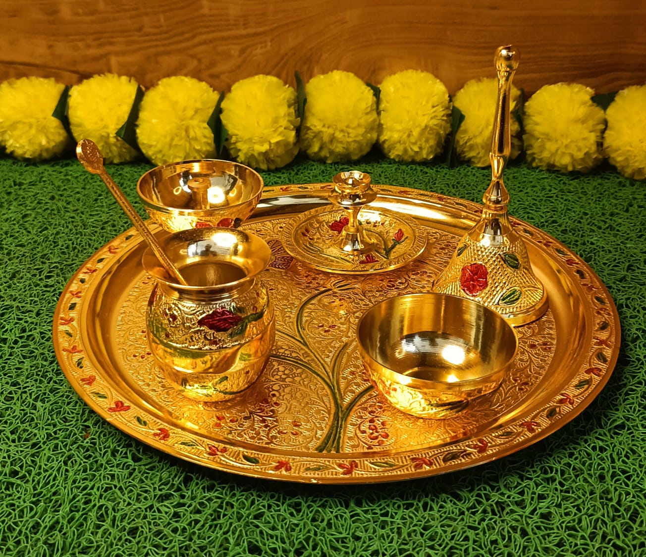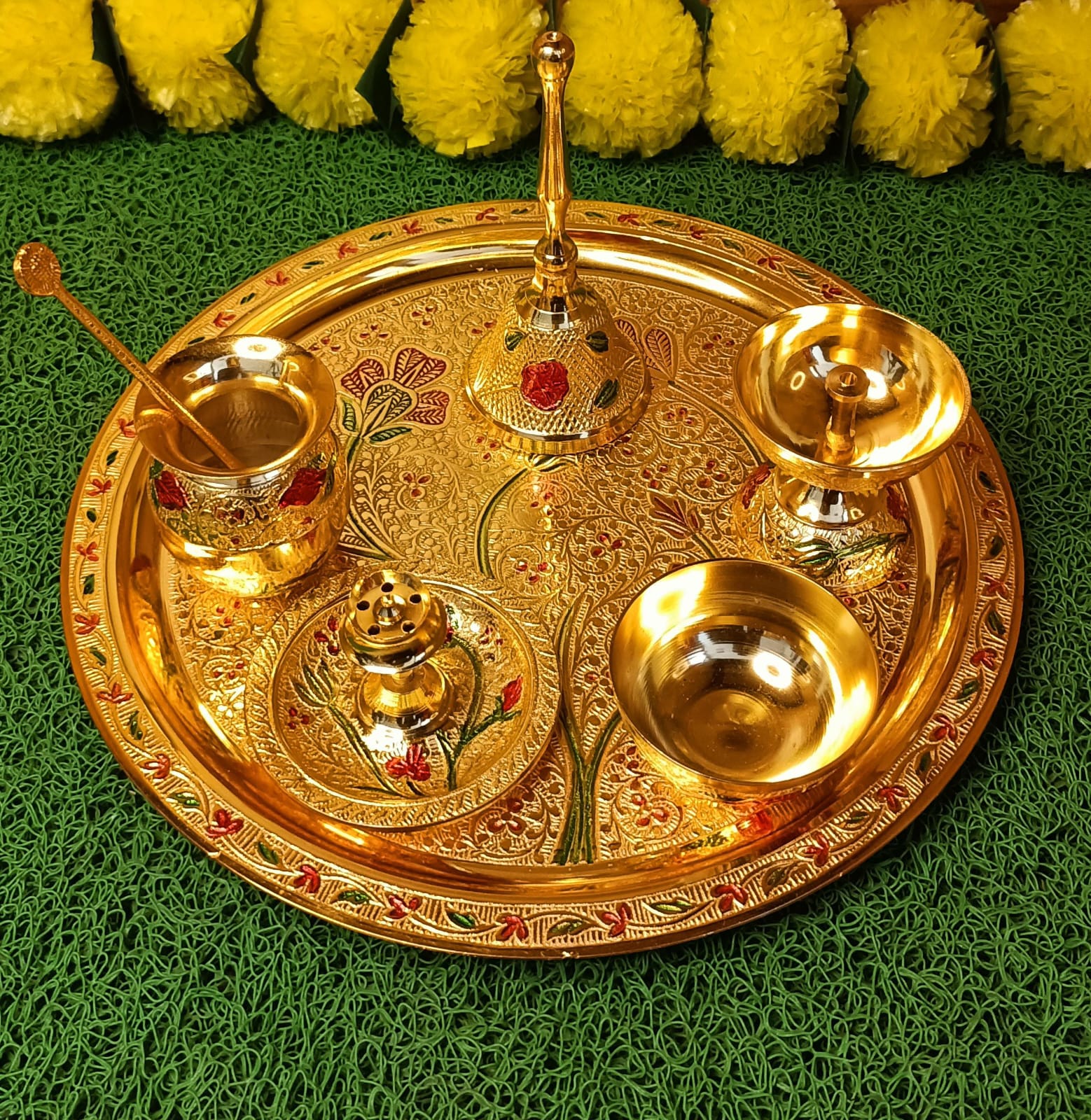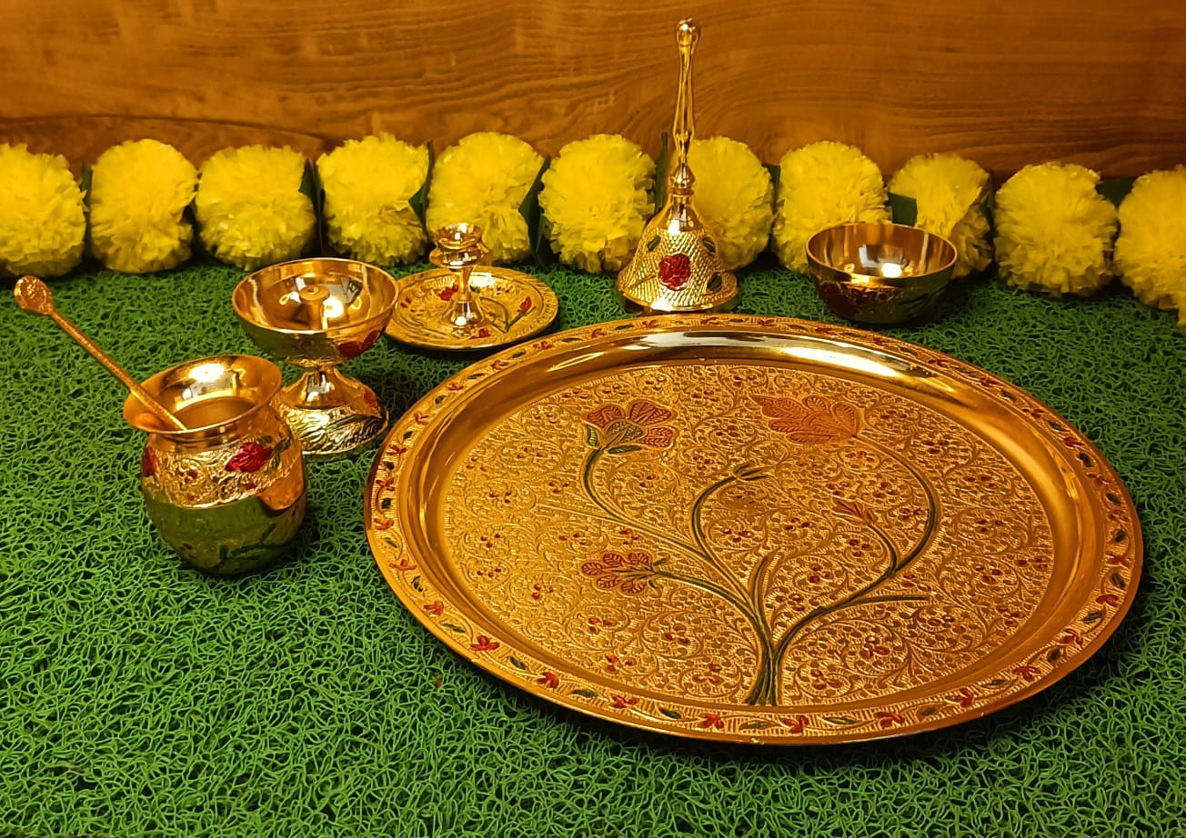 This Brass Heavy Quality Thali set features traditional meenakari designs and is perfect for pooja ceremonies. Made with premium materials, it offers superior quality and durability. Elevate your pooja experience with this beautiful and functional thali set. Material -Metal