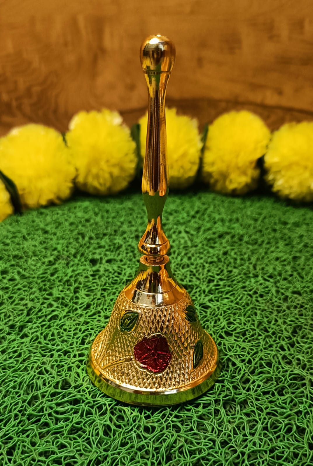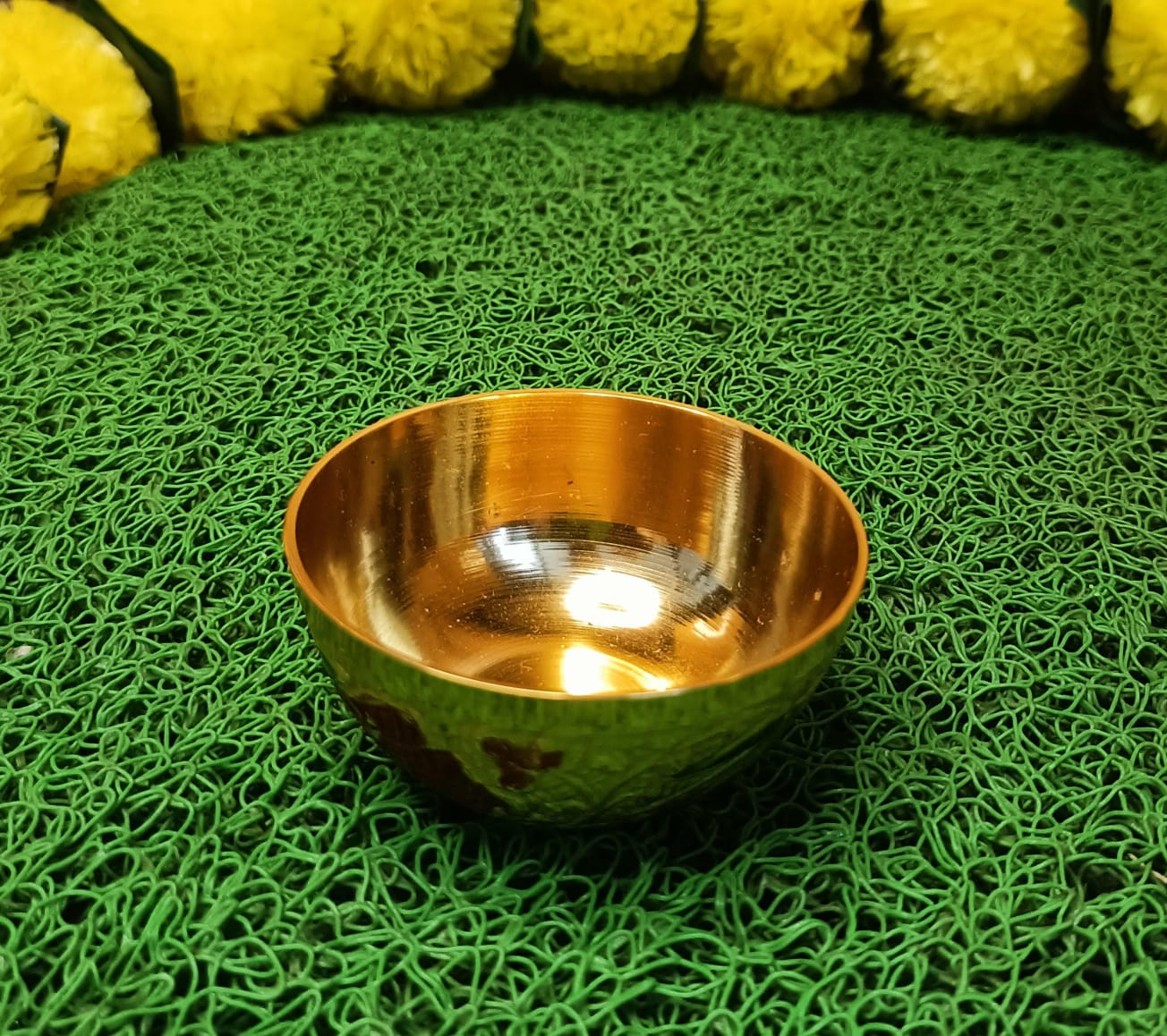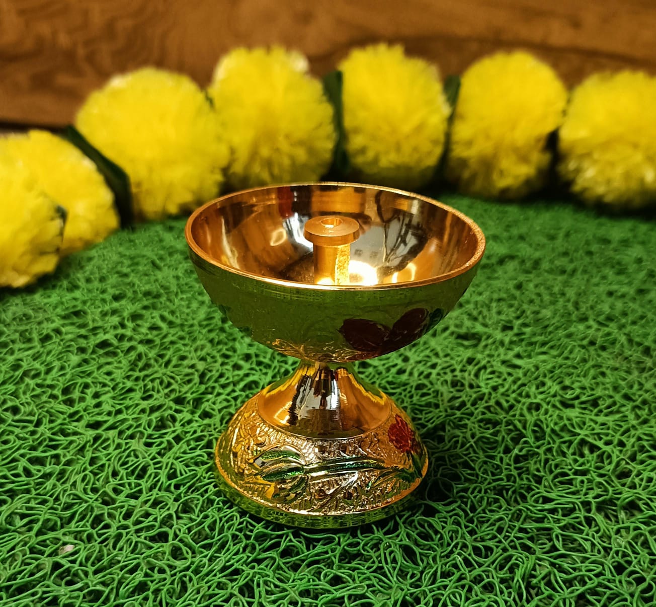 This Brass Heavy Quality Thali set features traditional meenakari designs and is perfect for pooja ceremonies. Made with premium materials, it offers superior quality and durability. Elevate your pooja experience with this beautiful and functional thali set. Material -Metal