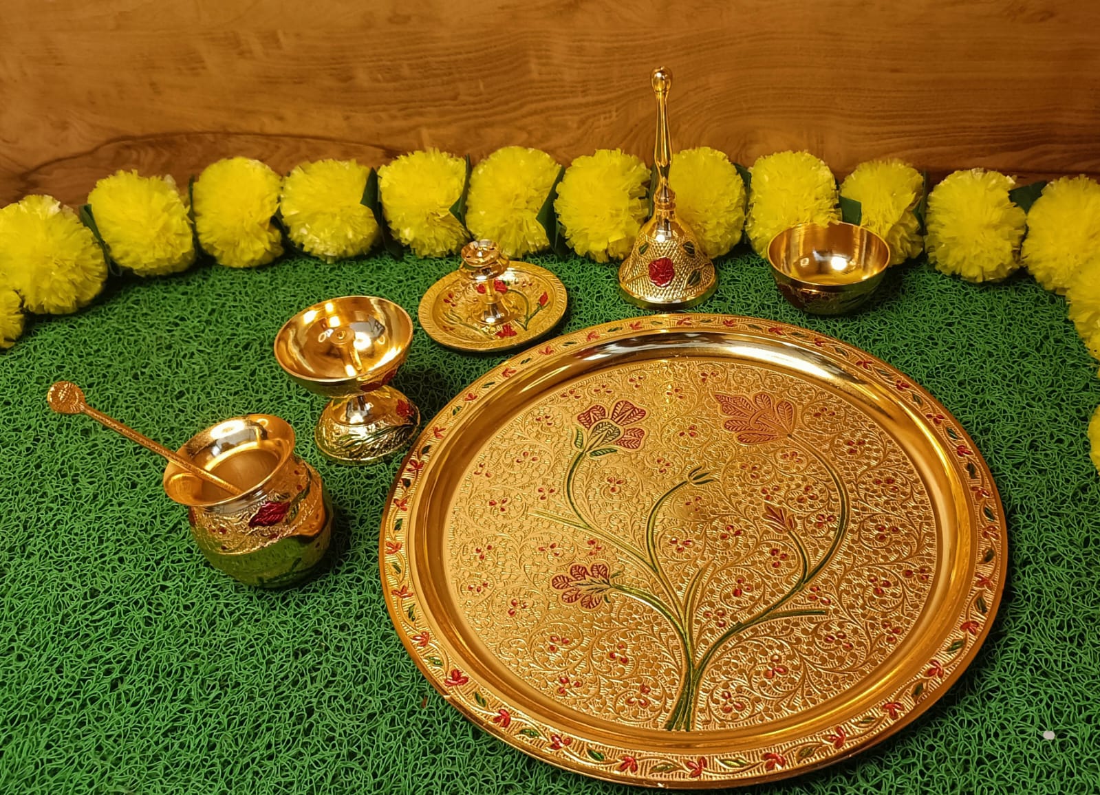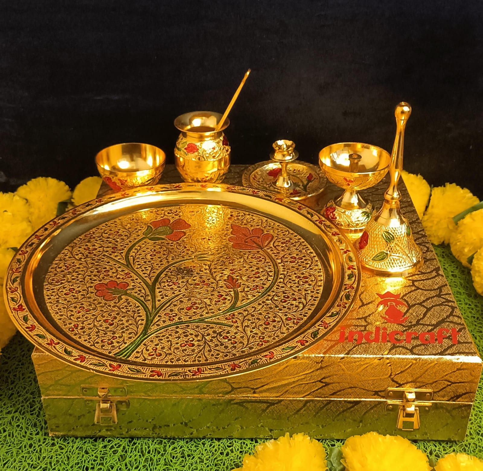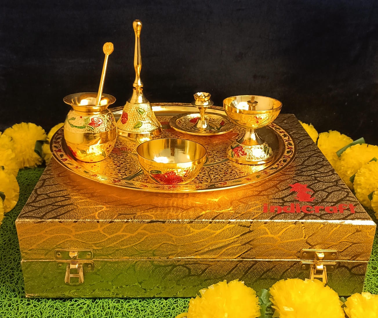 Silver-Gold Plated Thali 10" Distance across Including Embellishments Diya, Agarbatti Stand, Kumkum Bowl, Bowl, Bundling in Gold Rexin Box
