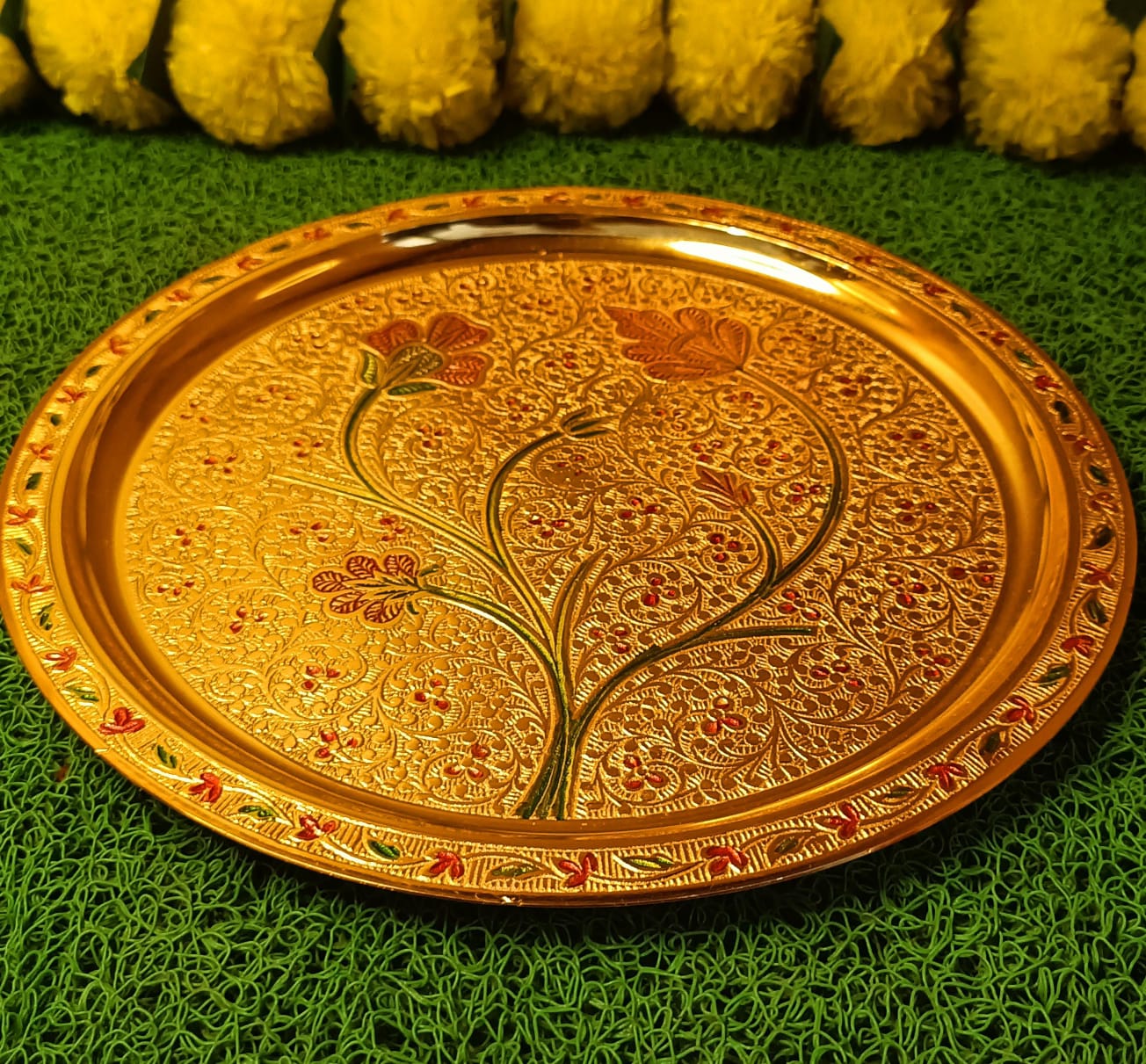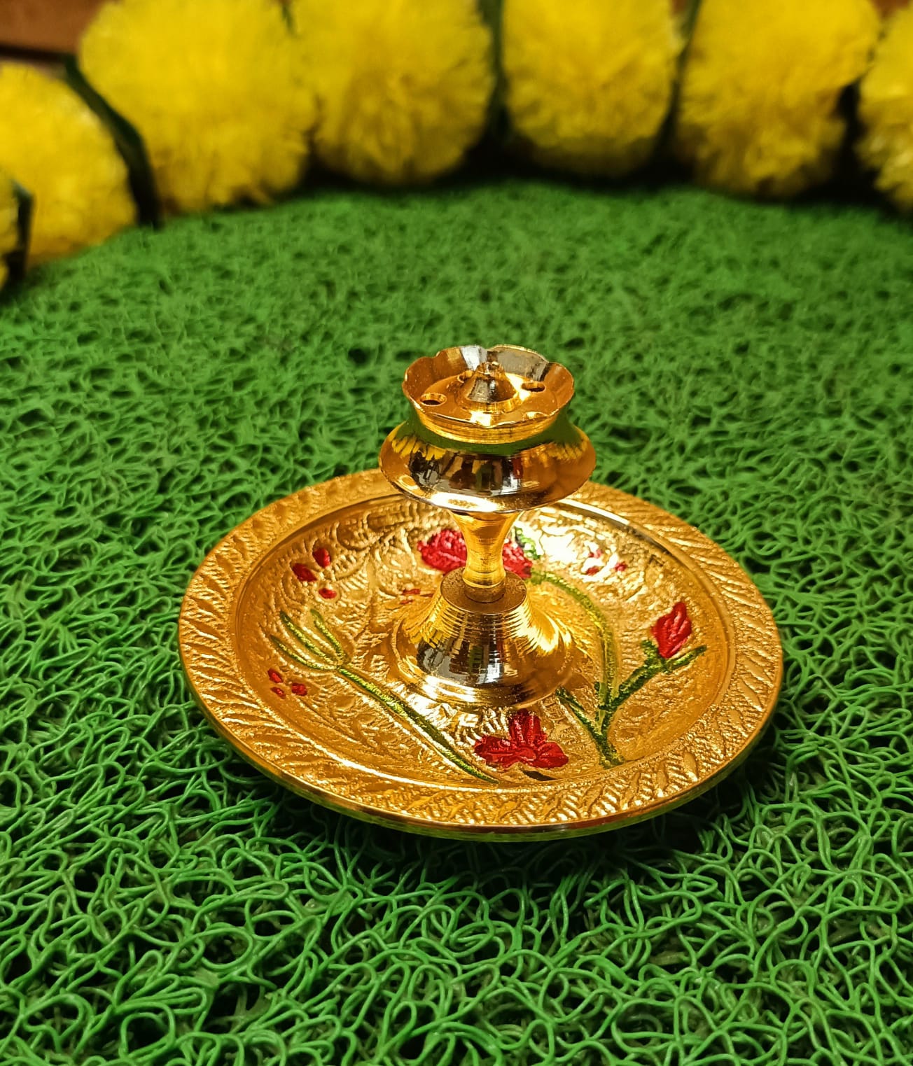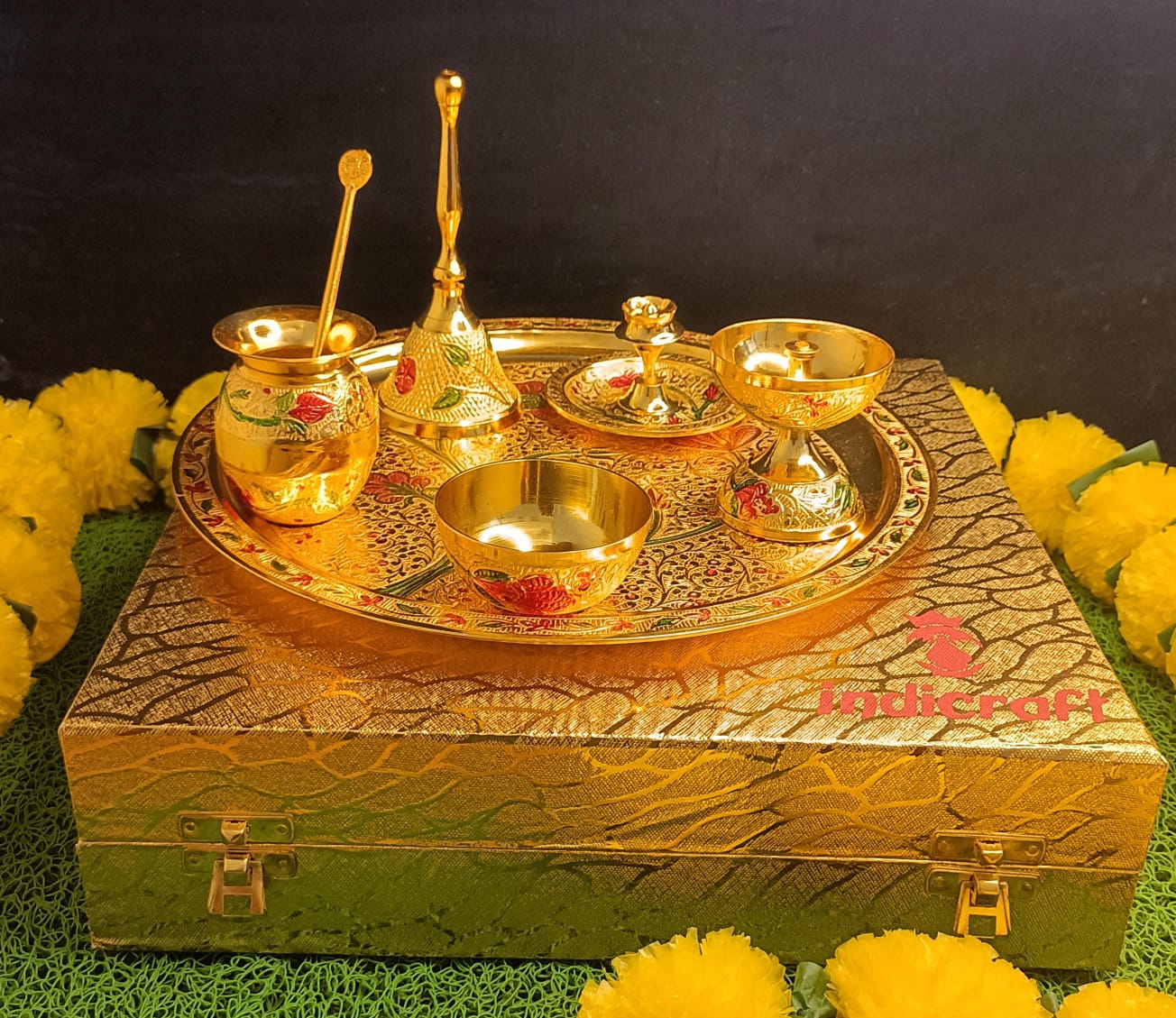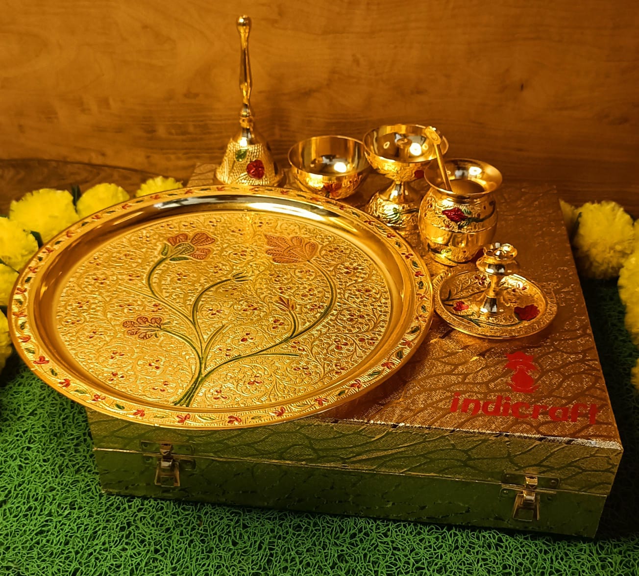 Silver-Gold Plated Thali 10" Distance across Including Embellishments Diya, Agarbatti Stand, Kumkum Bowl, Bowl, Bundling in Gold Rexin Box