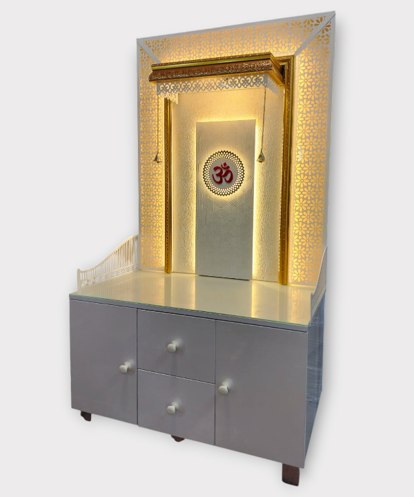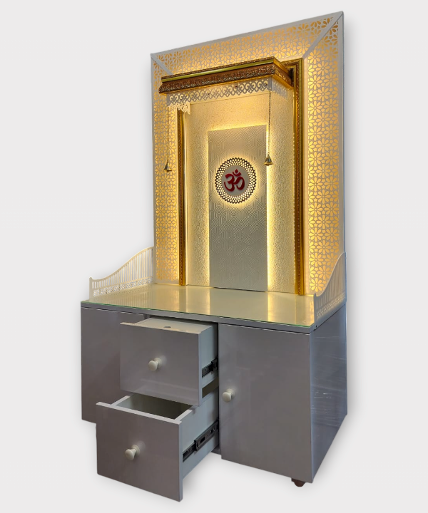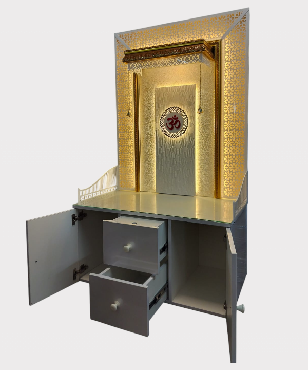 The spacious design includes multiple drawers and cabinets to neatly store pooja essentials like incense sticks, diya, matchbox, prayer books, and holy items. A smooth pull-out tray provides a convenient surface for lighting diyas or placing offerings during rituals, ensuring functionality along with aesthetics.