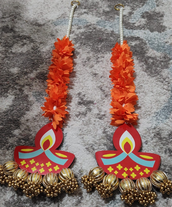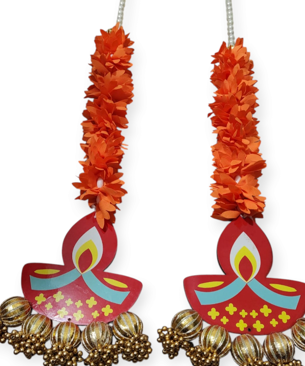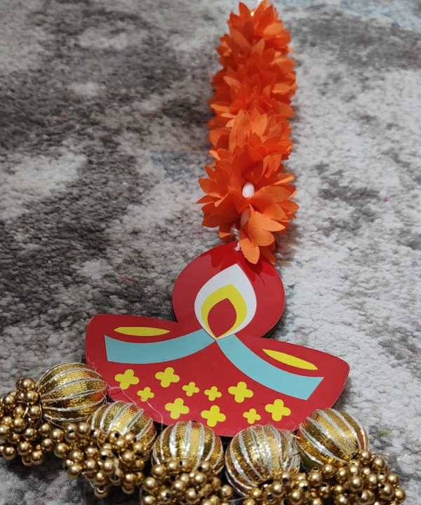 Bring divine light and positivity to your home with this beautifully crafted Diya Hanging Toran. Designed with vibrant orange floral garlands, colorful diya motifs, and golden hanging beads, this toran is perfect for decorating doors, walls, temples, or mandirs during Diwali, Navratri, Ganesh Chaturthi, and other festive occasions.