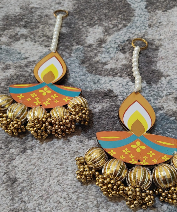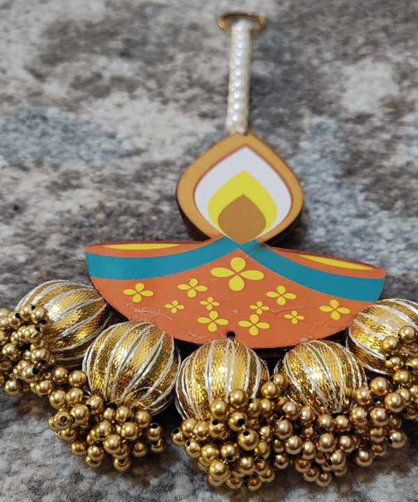 Brighten up your celebrations with this beautiful handcrafted Diya-shaped hanging. Designed with vibrant colors, pearl string, and golden bead tassels, this décor piece adds a festive charm to your doors, windows, pooja rooms, and walls.