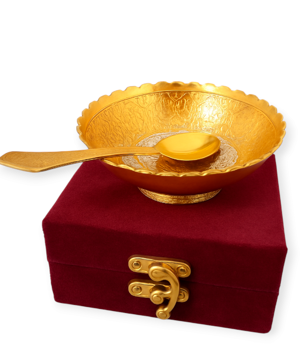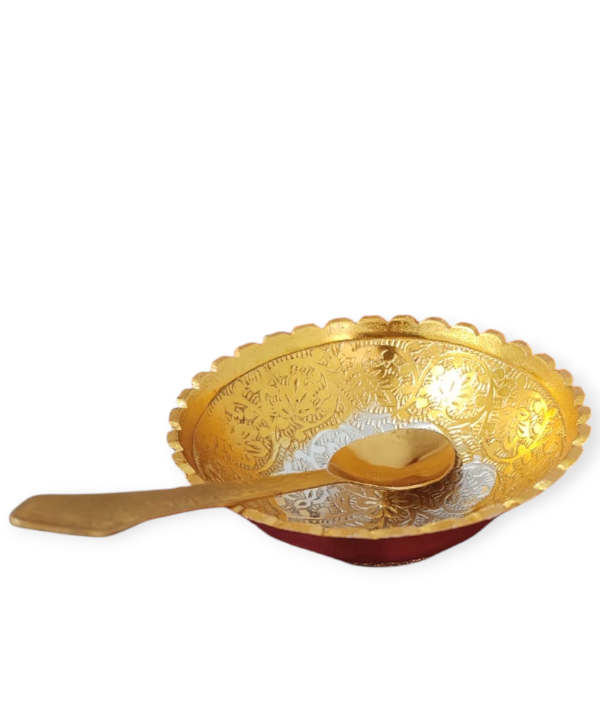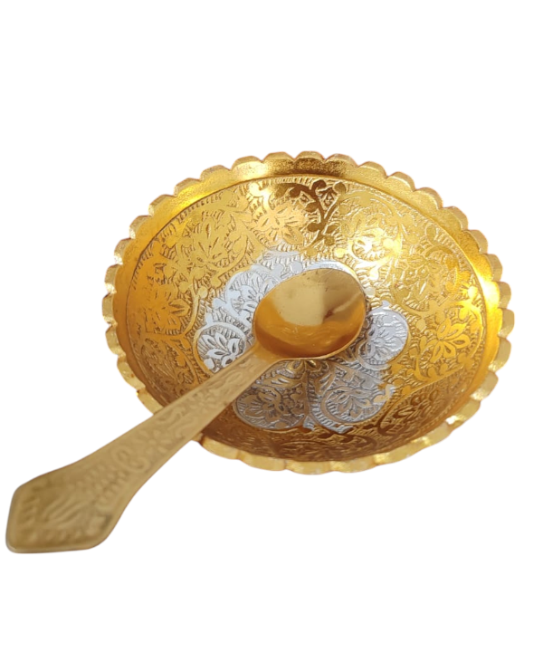 - π Color - Gold & Silver, Package Contains - Bowl with Spoon, Dimension - Bowl - 4 Inch, Spoon - 12 CM