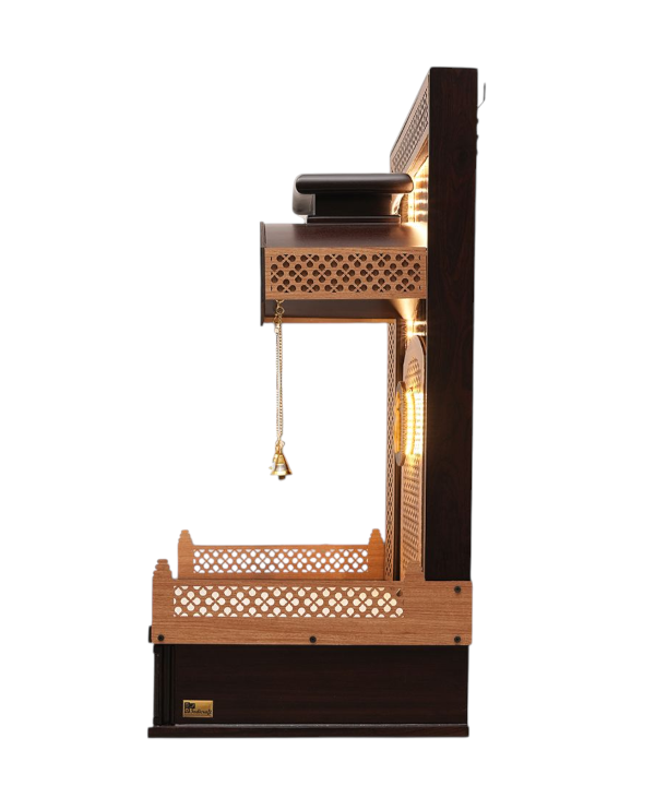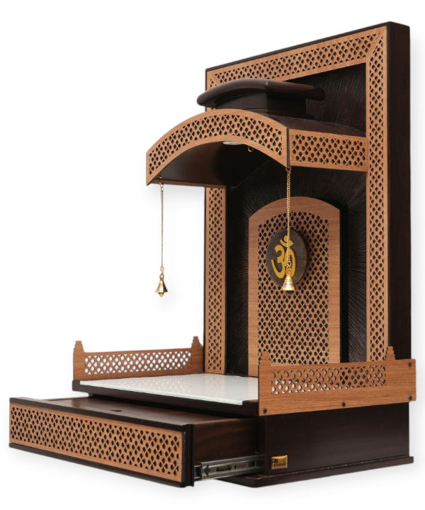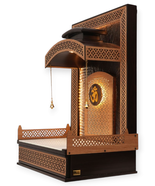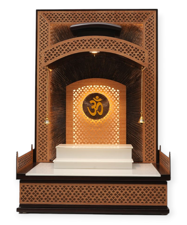 Designed with traditional Indian artistry and modern utility, this mandir features a serene finish, golden hanging bells, and an illuminating OM back panel.