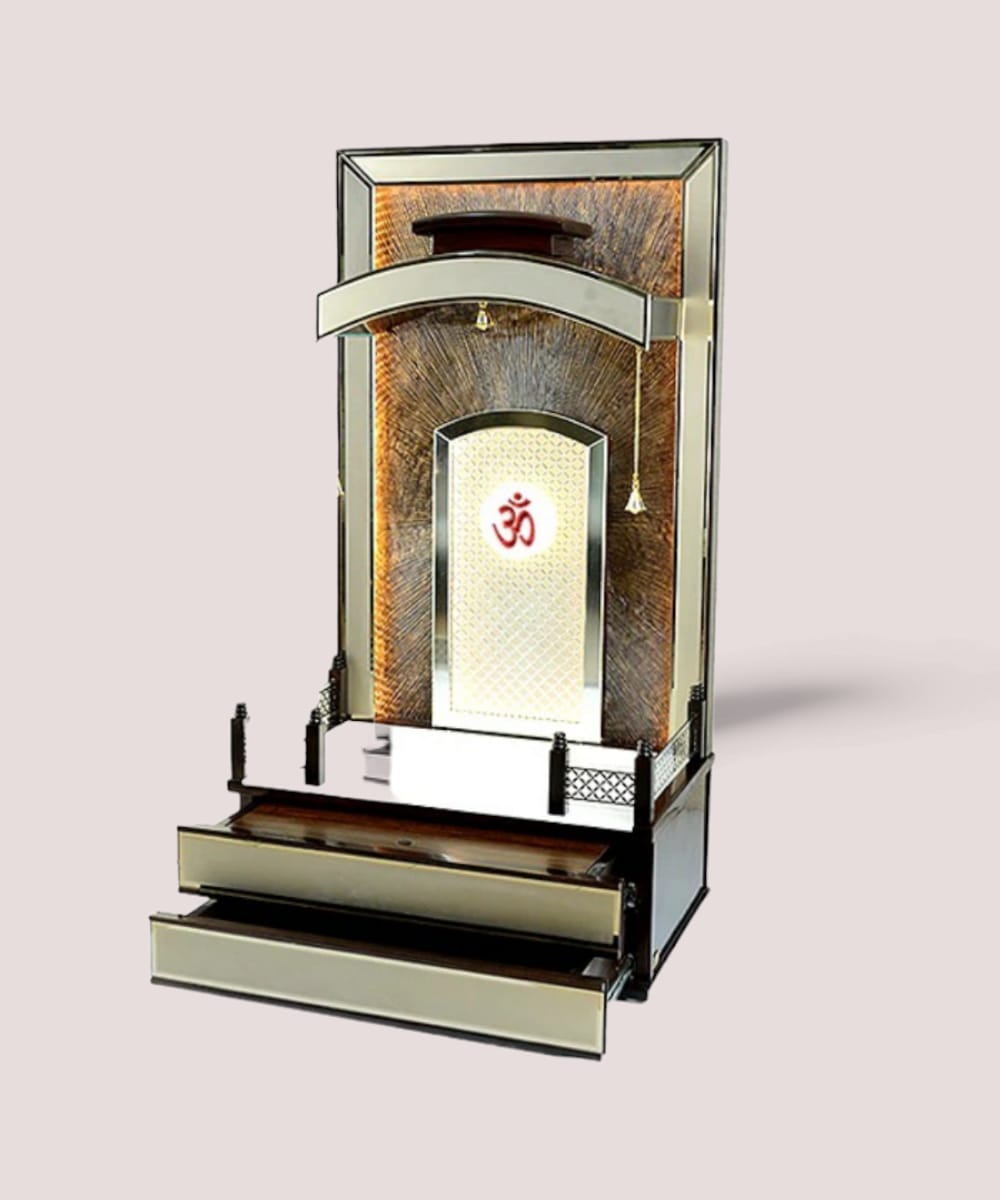 Designed with traditional Indian artistry and modern utility, this mandir features a serene finish, golden hanging bells, and an illuminating OM back panel.