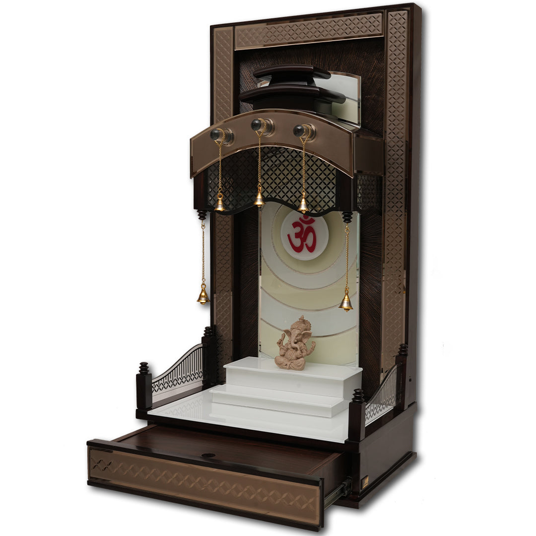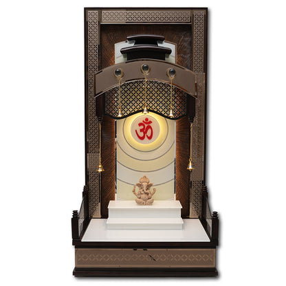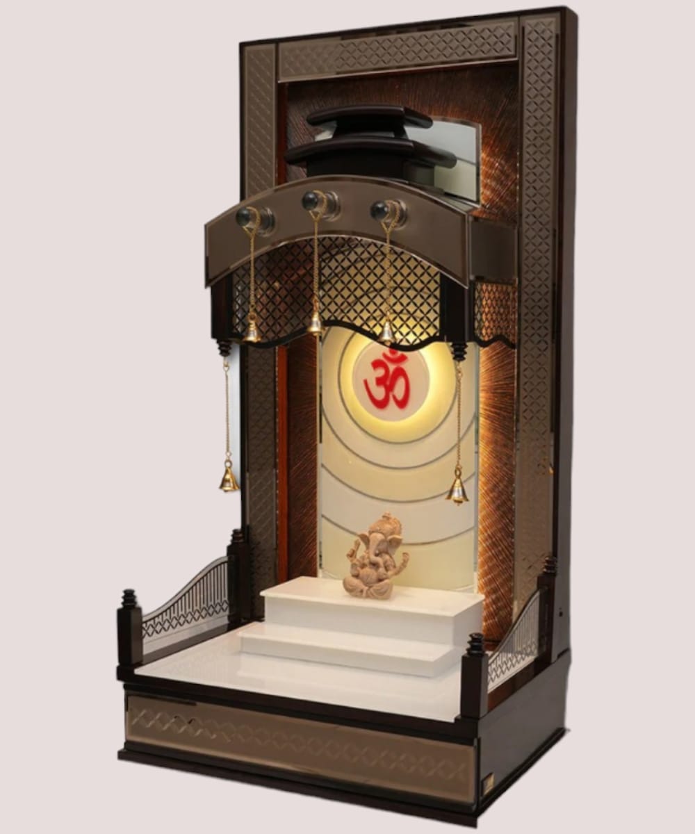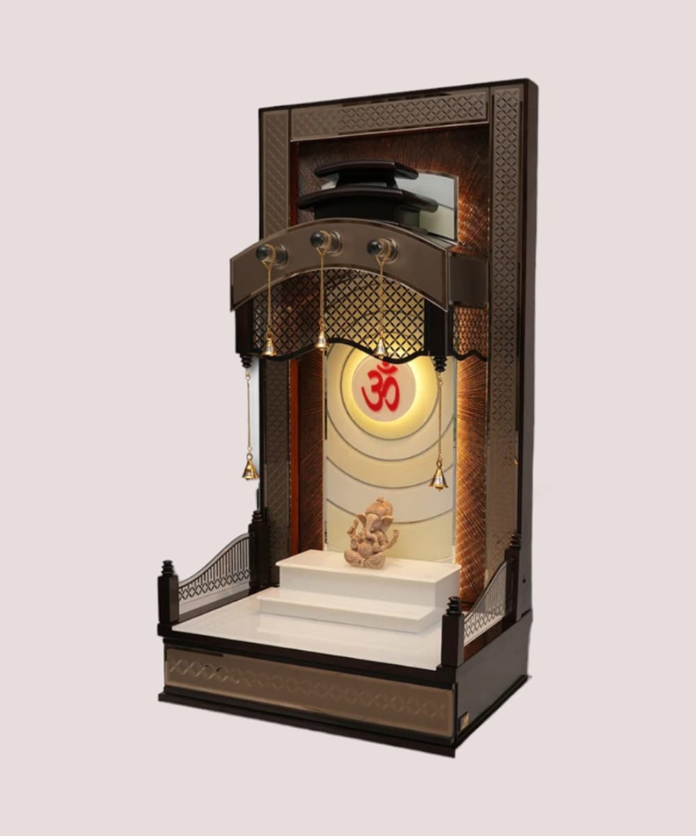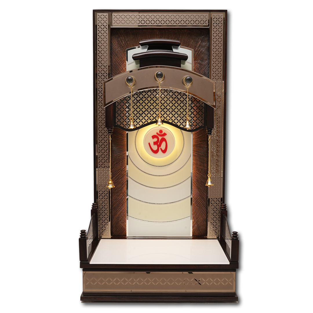 Designed with traditional Indian artistry and modern utility, this mandir features a serene finish, golden hanging bells, and an illuminating OM back panel.