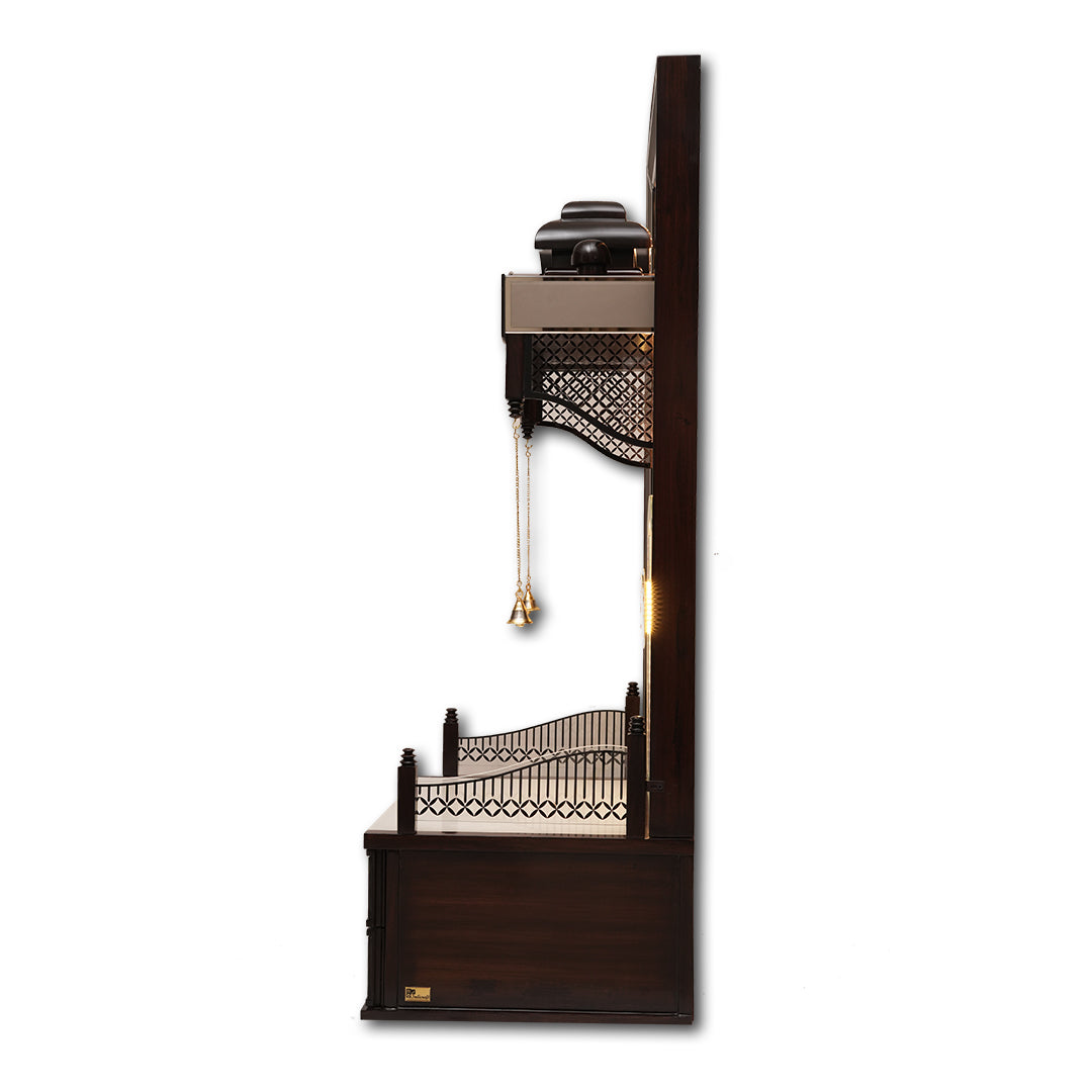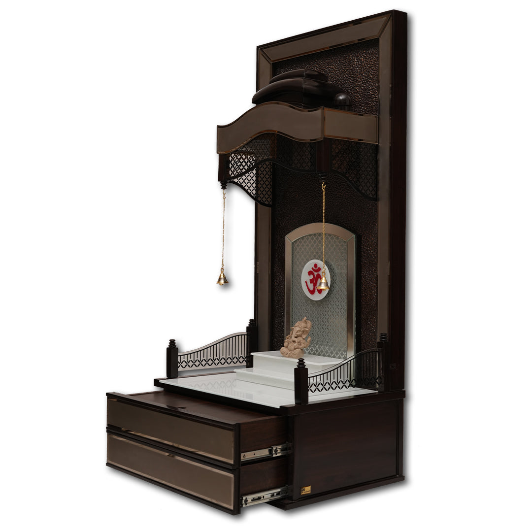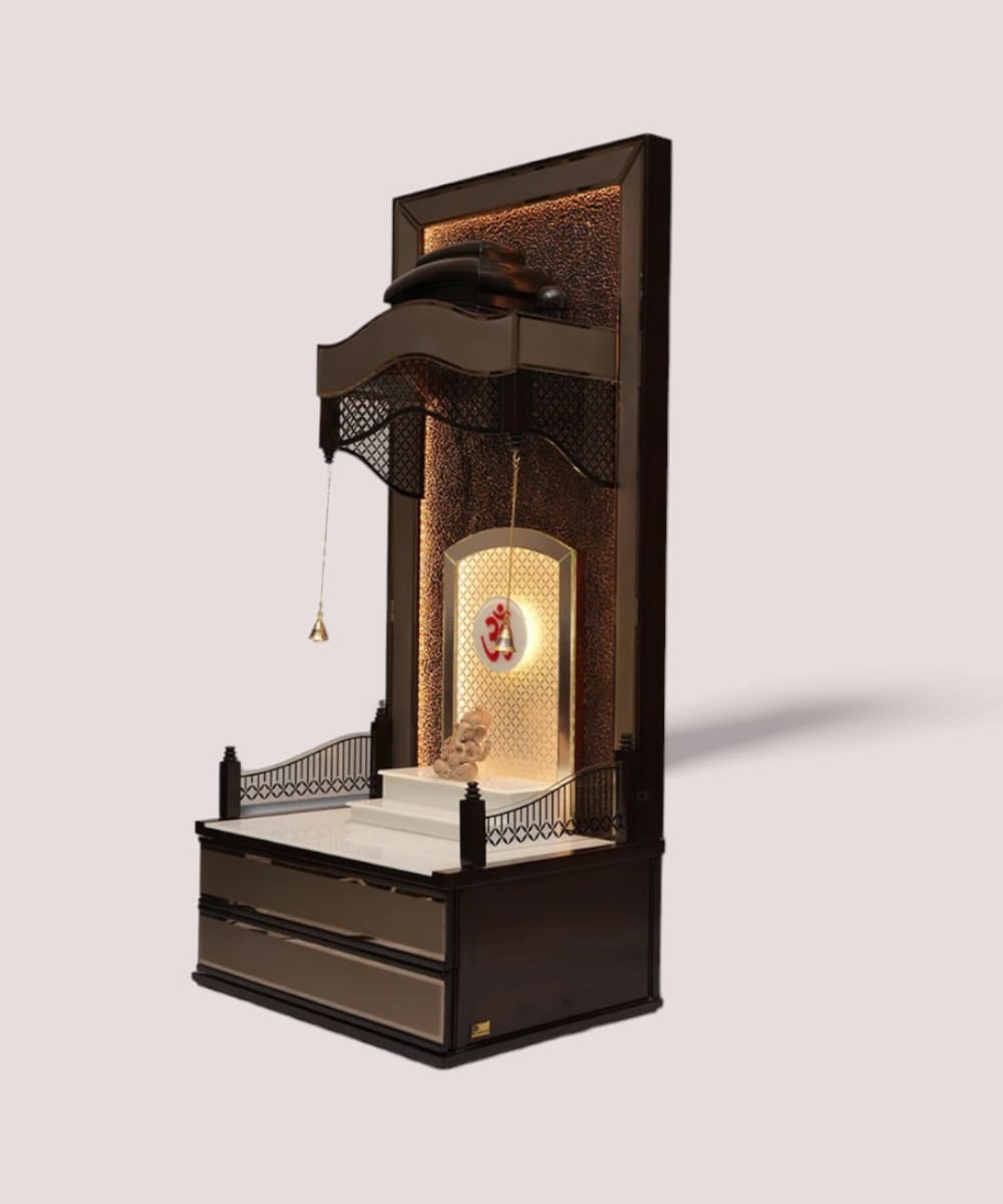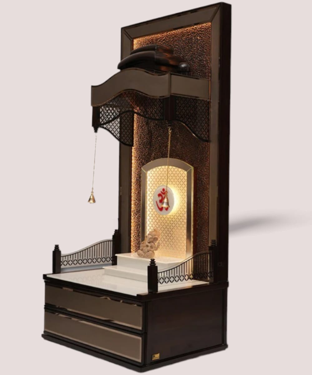 Designed with traditional Indian artistry and modern utility, this mandir features a serene finish, golden hanging bells, and an illuminating OM back panel.