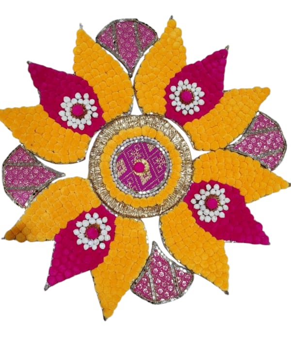 Add festive charm to your home with this vibrant pom-pom rangoli design. Featuring a beautiful combination of yellow & pink petals with white accents, this rangoli is perfect for Diwali, Navratri, weddings, and all auspicious occasions. Crafted with care, it brings positivity, elegance, and tradition to your décor.