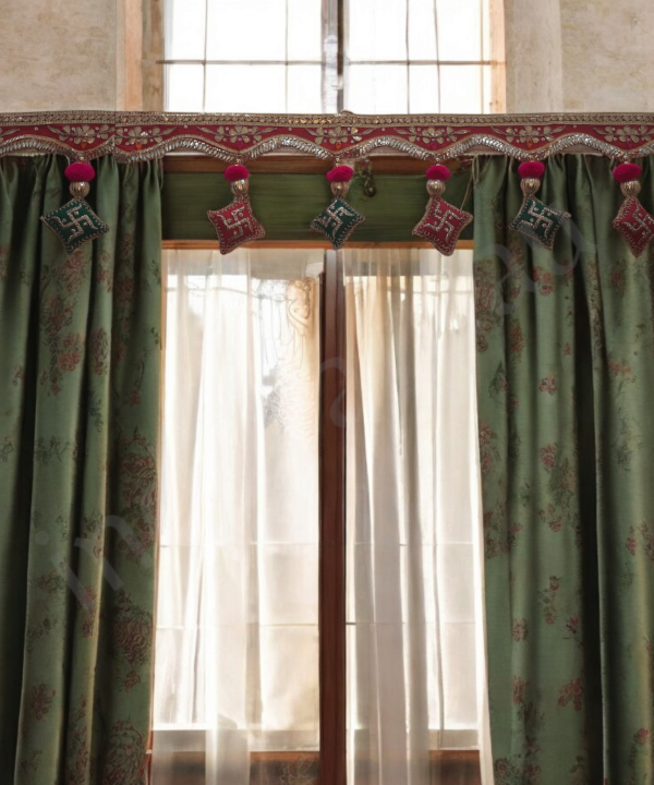 🌈 Vibrant Colors – Green and red velvet hangings with gold thread embroidery