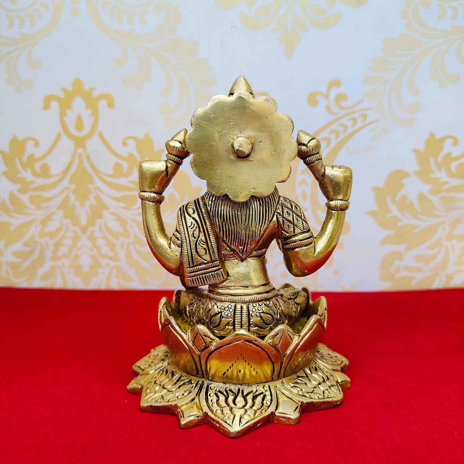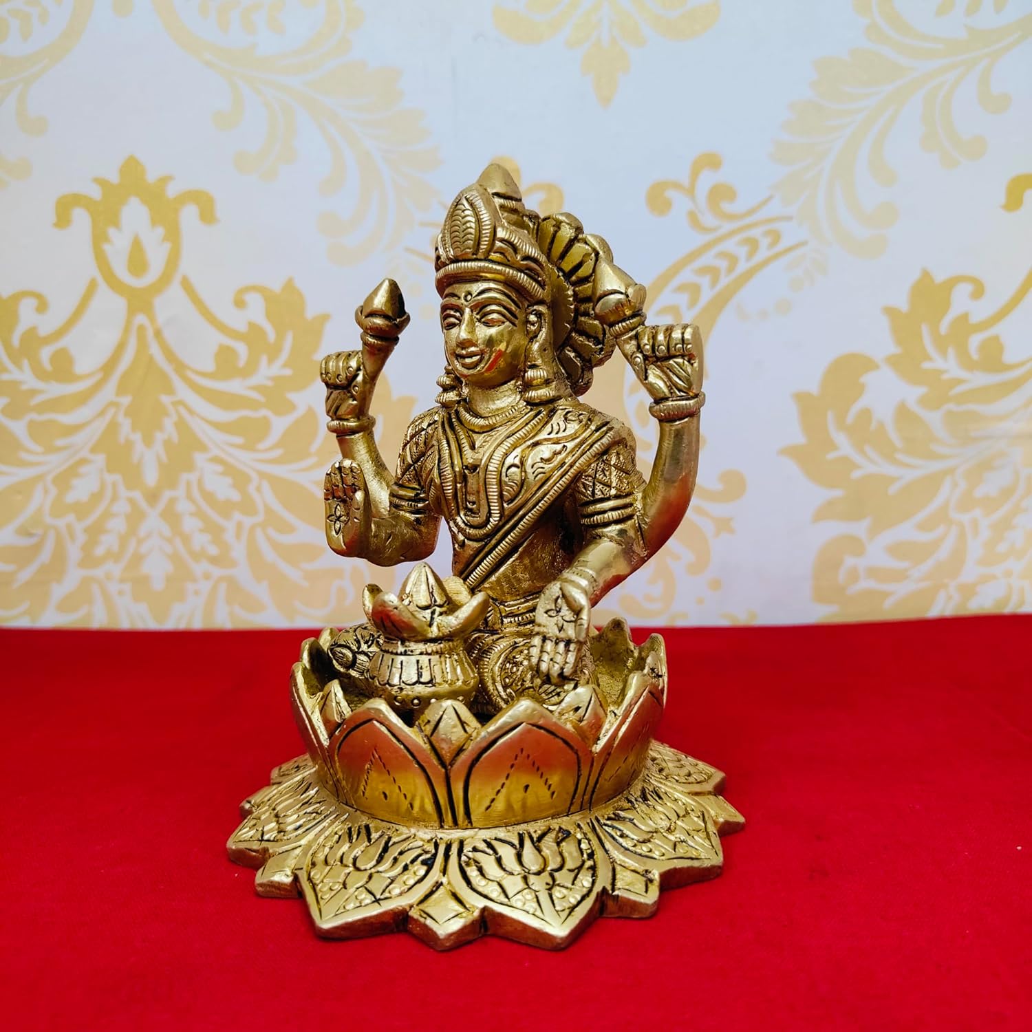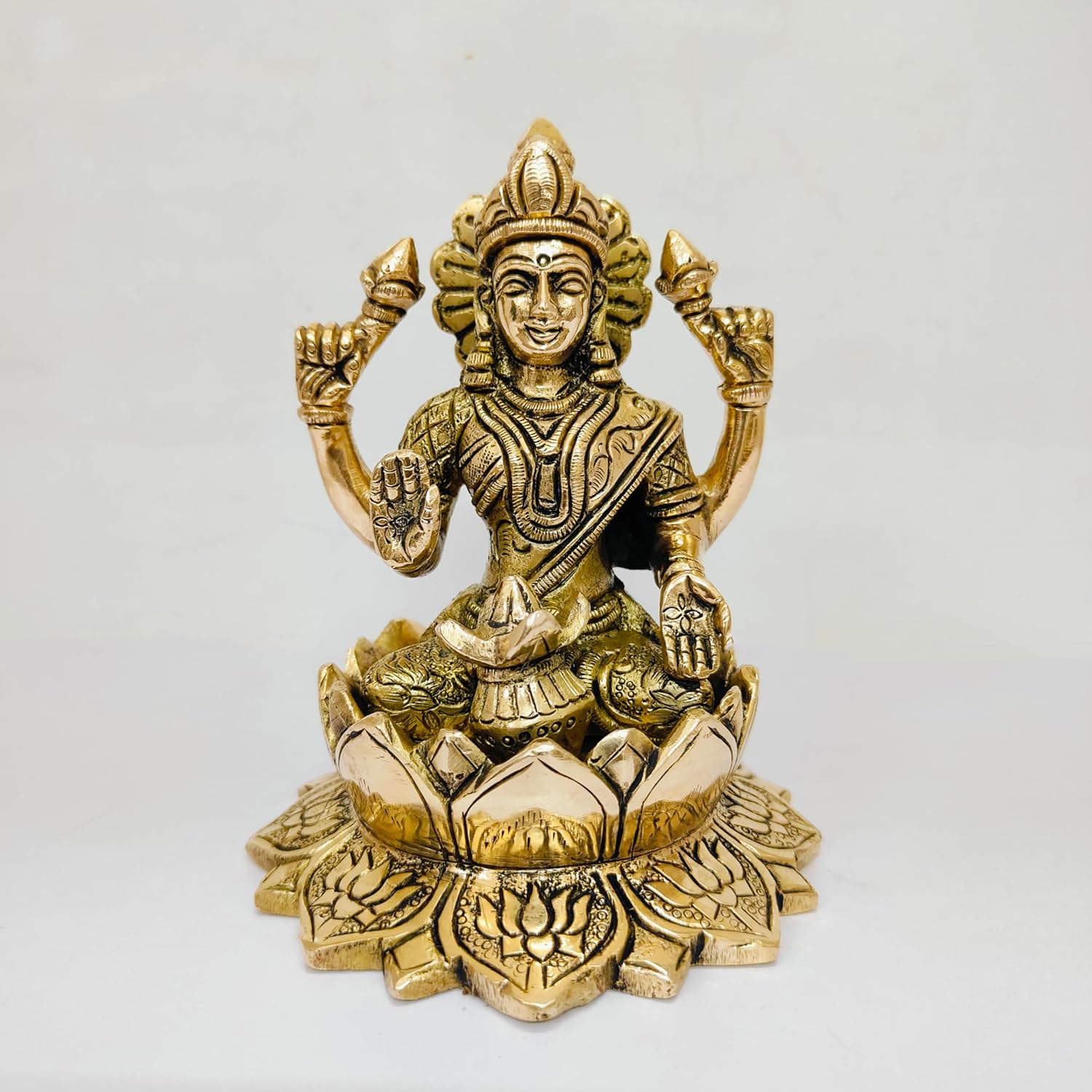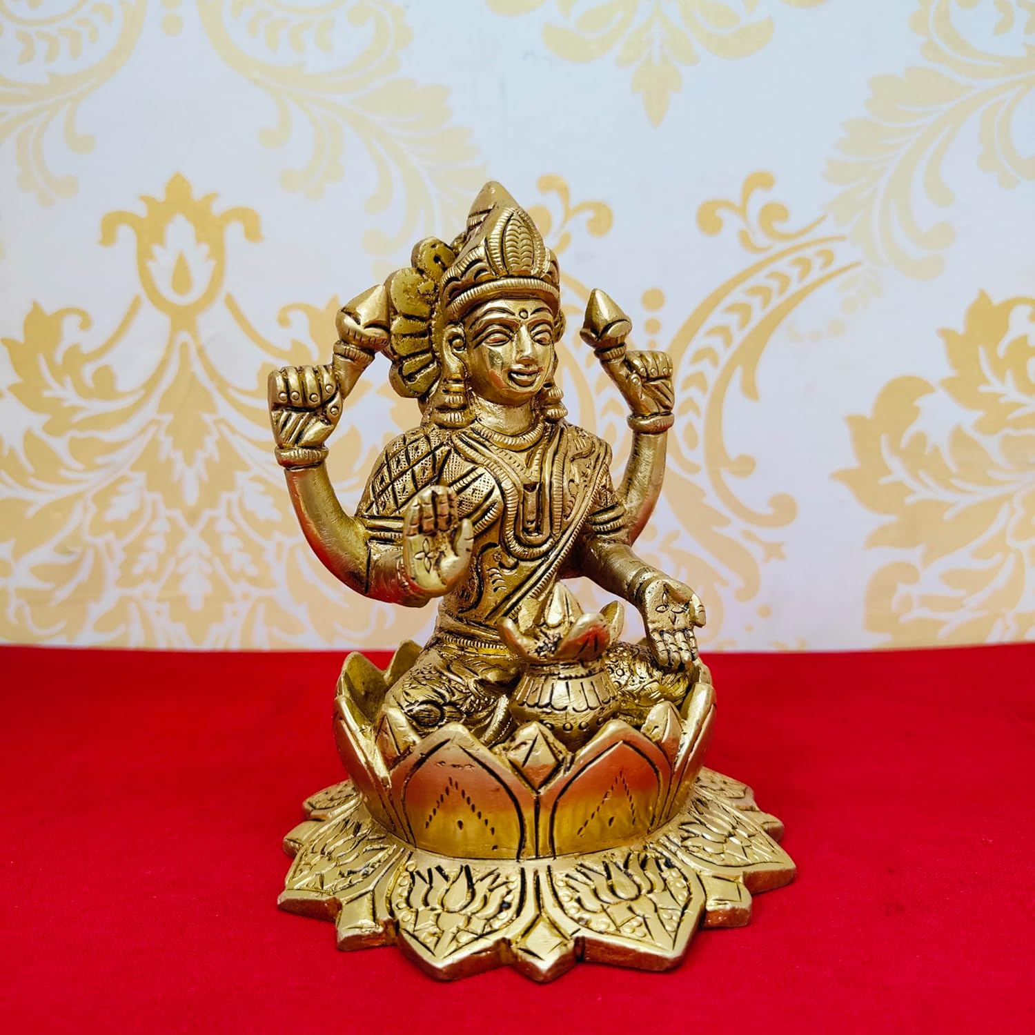 Expertly crafted from high-quality brass, this stunning Lakshmi ji on Lotus statue is a symbol of prosperity and abundance. With intricate detailing and a sleek design, this statue is a beautiful addition to any home or spiritual space. Invite blessings and wealth into your life with this timeless piece.