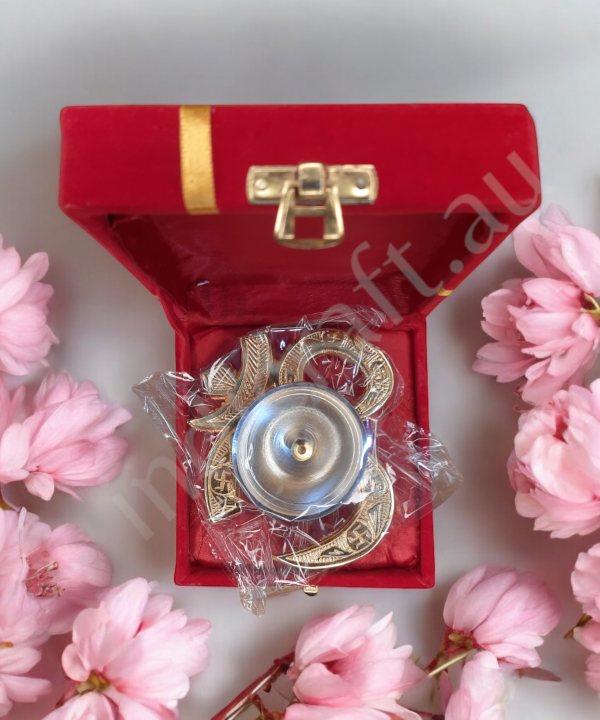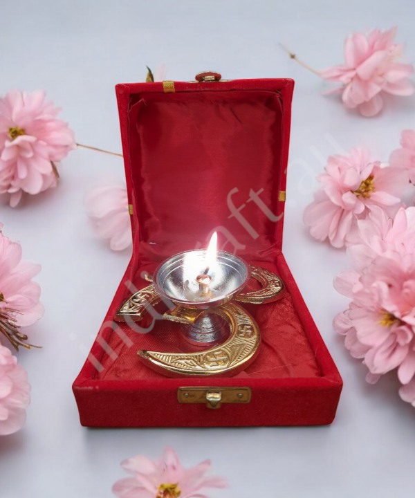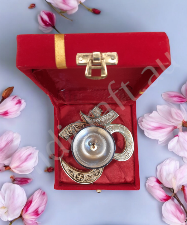 Elevate your festive decor with this elegant Om Design Diya, beautifully presented in a luxurious red velvet gift box. Crafted from high-quality metal , this diya features a delicate leaf-shaped base and a sleek handle for easy use. Perfect for Diwali, Pooja ceremonies, or as a return gift for special occasions, this diya brings a traditional touch with a modern charm. Its compact size and stunning presentation make it ideal for gifting and temple decor alike.