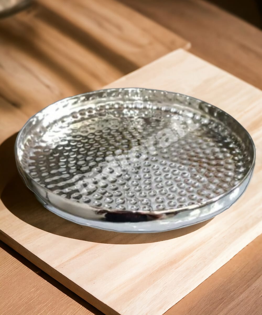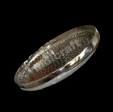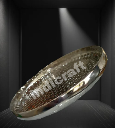 - This Indian serving tray is made in India, with an elevated border across the tray, engraved with orient motif, and very popular as a decorative bowl, tray, and plate or for floating candles.
