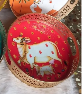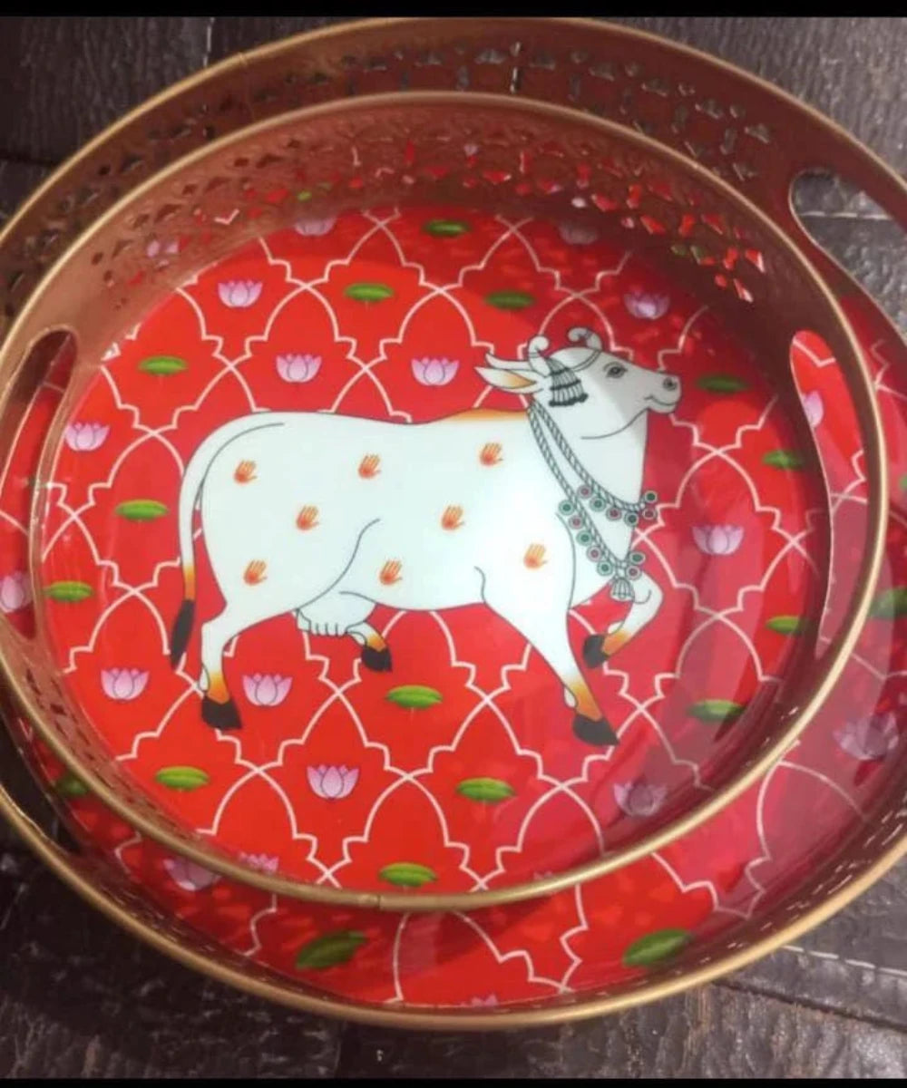 The trays are handcrafted with sheet metal, spray painted with gold paint with a digitally printed transfer of the Pichwai cow . The painting is then finished with an enamel coating for that glossy finish.