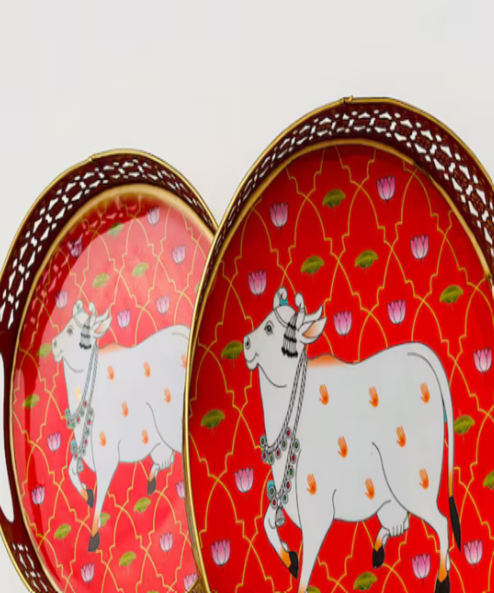 Exquisite pair of round metal trays with Pichwai design Nandi cow on a vibrant Red backdrop.