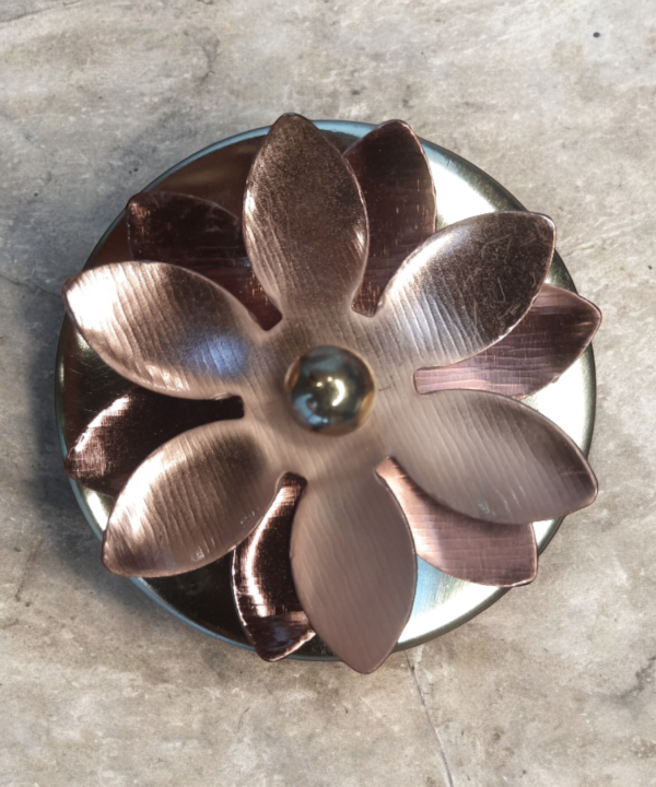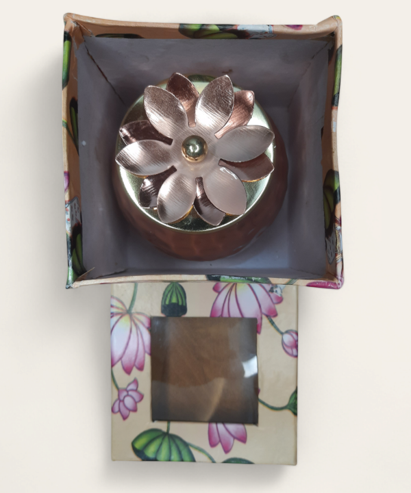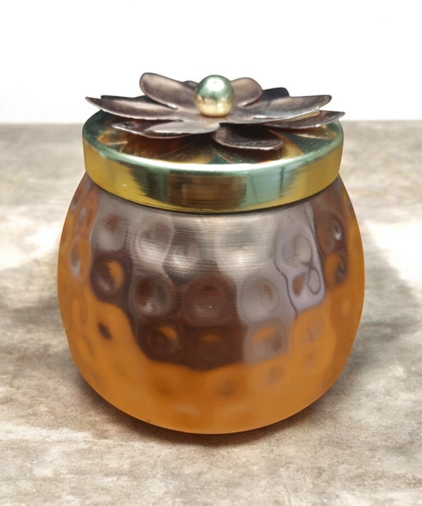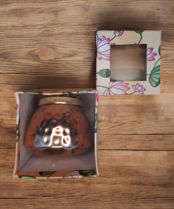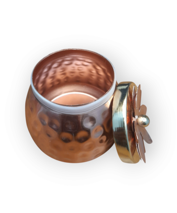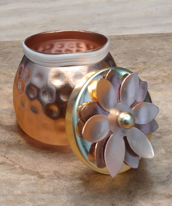 Add a touch of elegance to your home with this beautifully handcrafted metal jar featuring a floral lid design. Made from premium quality hammered metal, this jar combines traditional artistry with modern aesthetics. The rose gold body and intricate flower motif on the lid make it a standout piece for any setting.