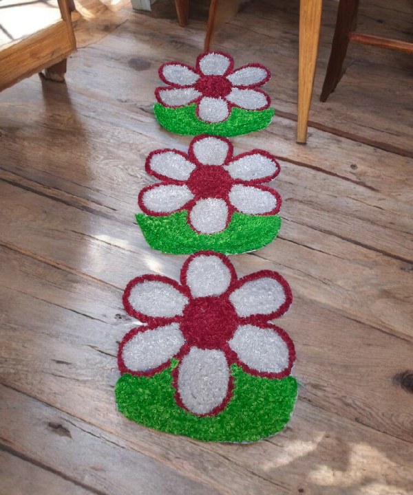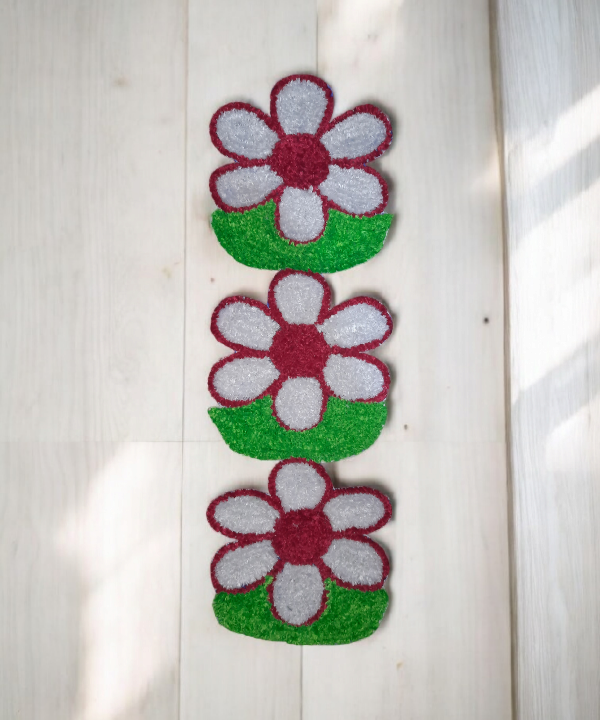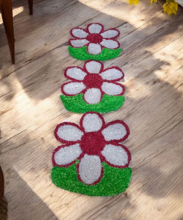 Add purity and elegance to your festive decor with this Three White Flowers Woolen Rangoli Mat, delicately handcrafted with soft wool and detailed green leaf accents. The serene white blooms symbolize peace and positivity, making it perfect for your pooja room, Diwali setup, or housewarming décor.