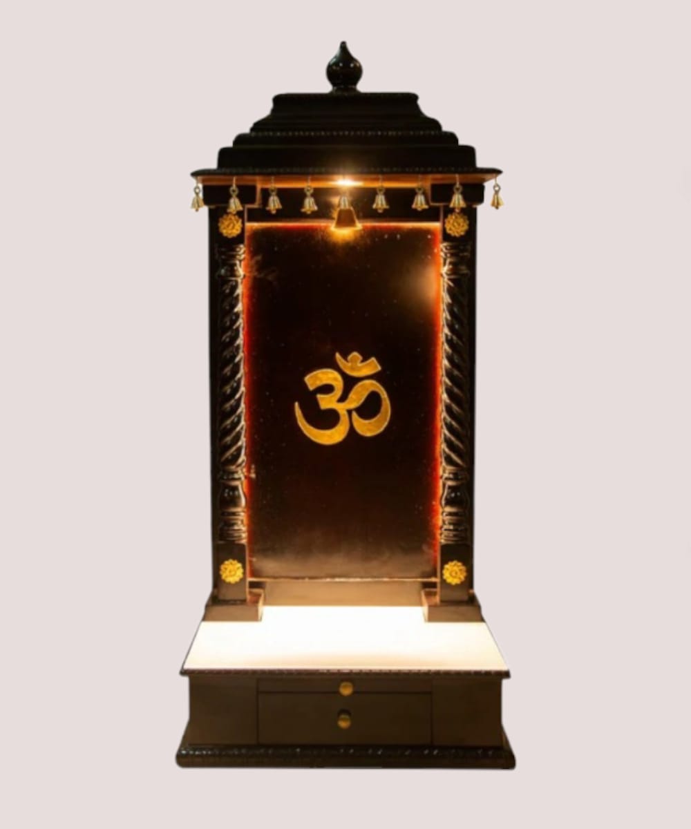 The handcrafted wooden temple, adorned with light and glass fittings, epitomizes artistic craftsmanship.