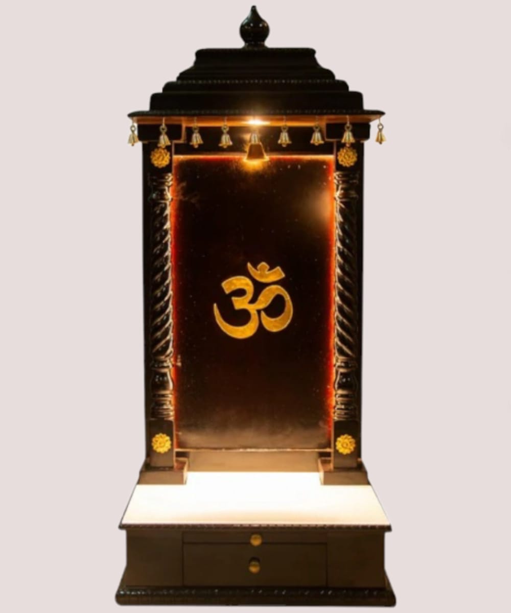 A Puja mandir with inbuilt lights and hanging bells can be a beautiful addition to your home, providing a dedicated space for prayer and meditation while also adding aesthetic charm.