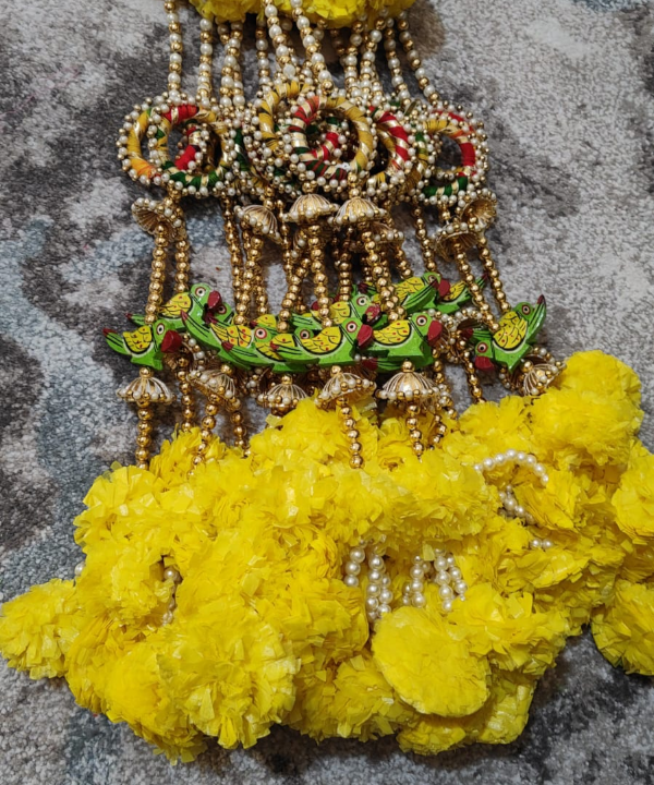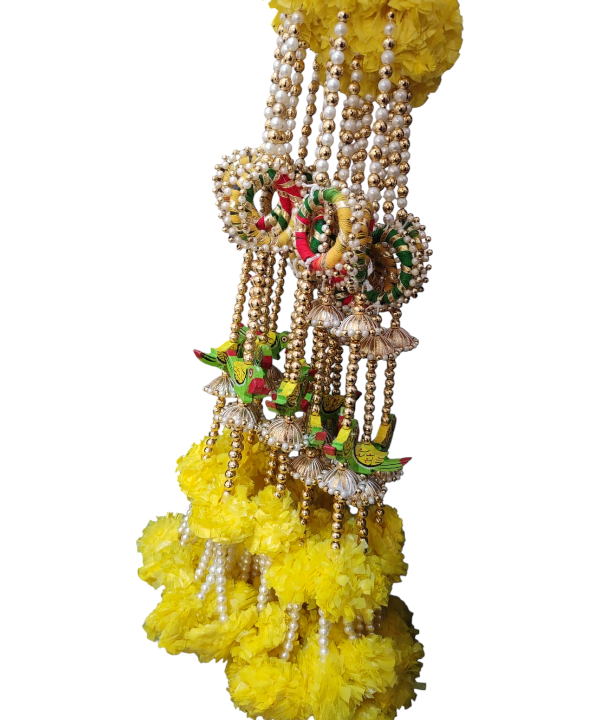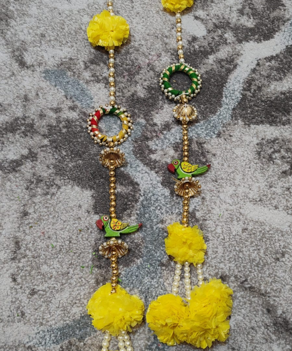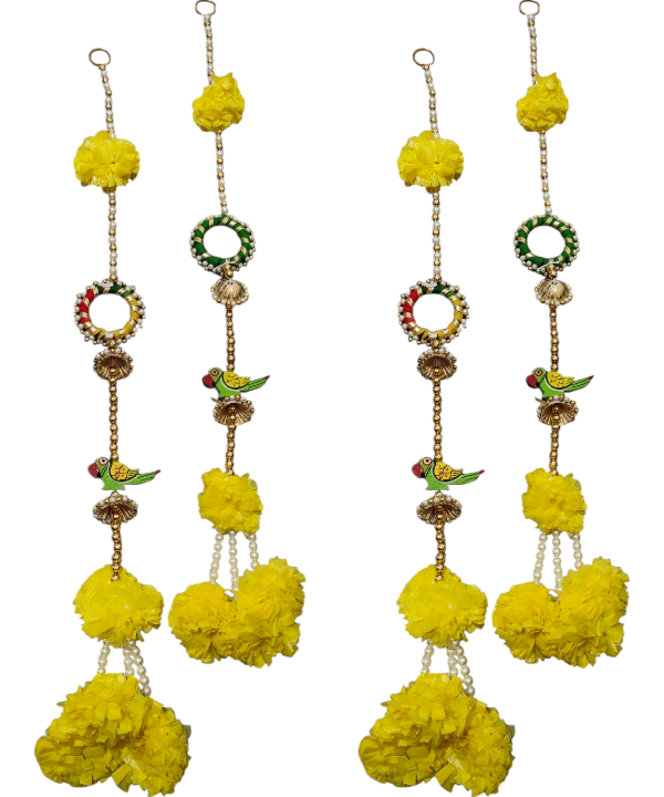 Add a splash of color and tradition to your décor with this vibrant pair of yellow artificial latkan hangings. Designed with fluffy yellow flowers, pearl strings, golden embellishments, and cute parrot motifs, these latkans are perfect for enhancing the beauty of your doorway, toran, pooja room, mandap, balcony, or festive setup.